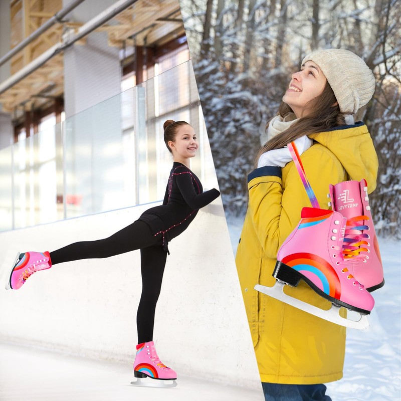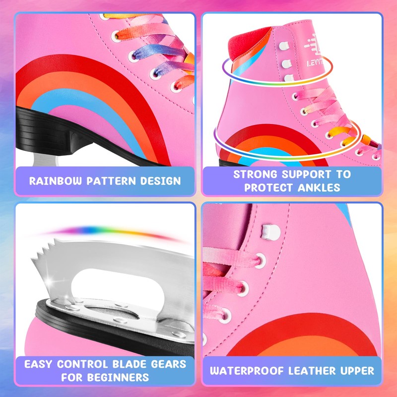 LEVYTEMP Women's/Girls Figure Ice Skates - Youth Pink Rainbow Figure Skating Shoes with Two Insoles - Comfortable, Safe Indoor Outdoor Rink Size US 5