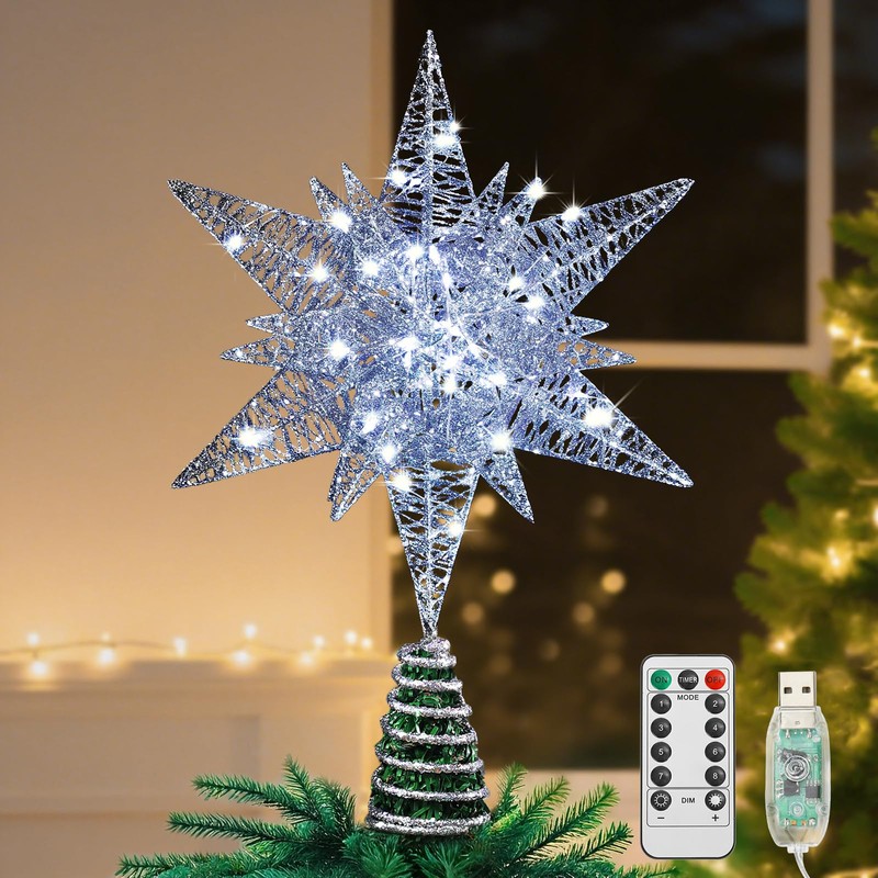 Lewondr Christmas Star Tree Topper, USB Powered Remote Controlled 11 Inch Multilayer Hexagonal Tree Toppers Christmas Decor with 8 Light Modes for Home Holiday Xmas, Timer Function, Silver