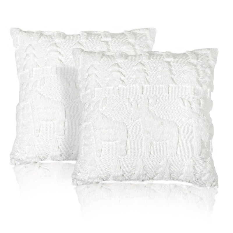 Lewondr Christmas Throw Pillow Cover 18x18, Set of 2 Super Soft Faux Fur Pillow Covers Velvet 3D Christmas Tree Reindeer Embroidery Square Throw Pillowcase for Living Room Bed Sofa Home Decor, White