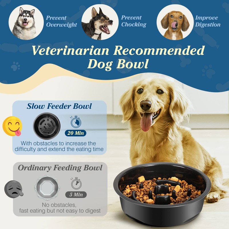 - đă2-in-1 Dog Bowls Setă: Comes with 1 slow water bowl and 1 slow feeder bowl to effectively control the eating speed, prevent bloat and improve digestion. Besides, the slow feeder has the same diameter as water bowl. You can replace the water bowl if your dog need to control the eating speed, or make it worked as a 2 bowls set with food and water.