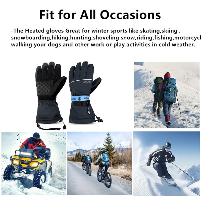 The Heated gloves Great for winter sports like skating,skiing ,snowboarding,hiking,hunting,shoveling snow,riding,fishing,walking your dogs and other work or play activities in cold weather. The gloves keep your hands warm, comfortable , So you’re not stuck with overheated hands or frozen fingers.
