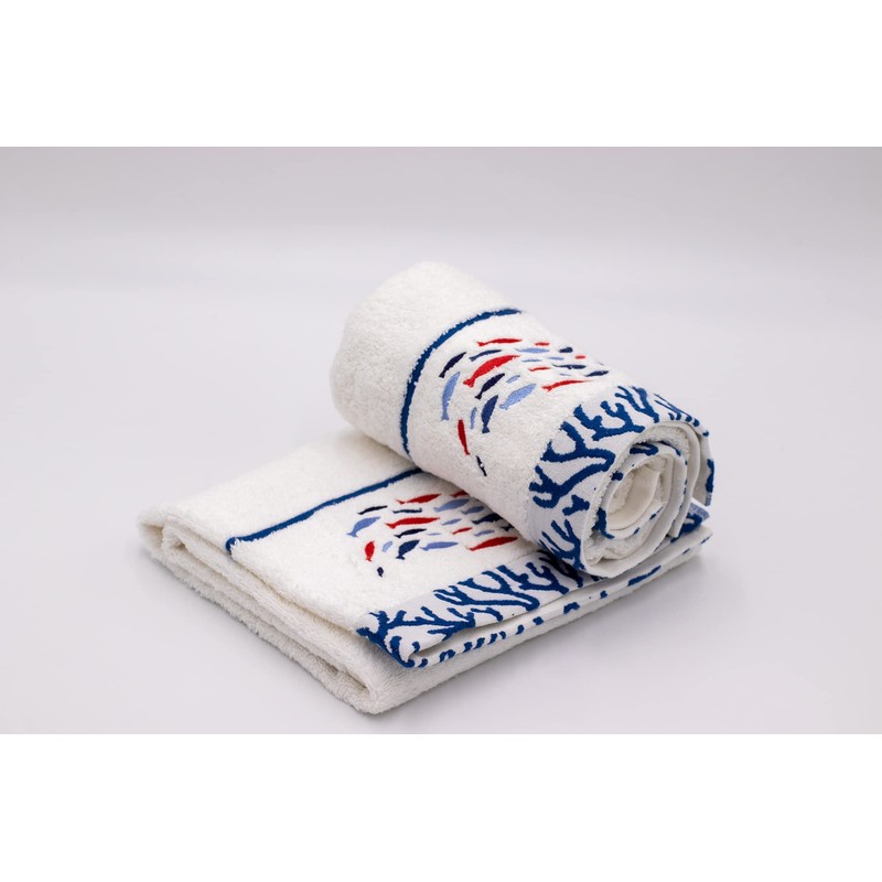 - Intricate Embroidered Fish on a White Towel Complimented with an Embroidered Coral Blue End