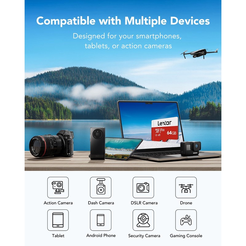 • High Speed Memory Card: Leverages UHS-I technology for a transfer speed up to 100MB/s. Loads apps faster with A1-rated performance. (Based on internal test environment of Lexar, so the actual speed may vary with different host devices and environments. For devices that don't support UHS-I, the transmission speed will be different due to interface limitations.)