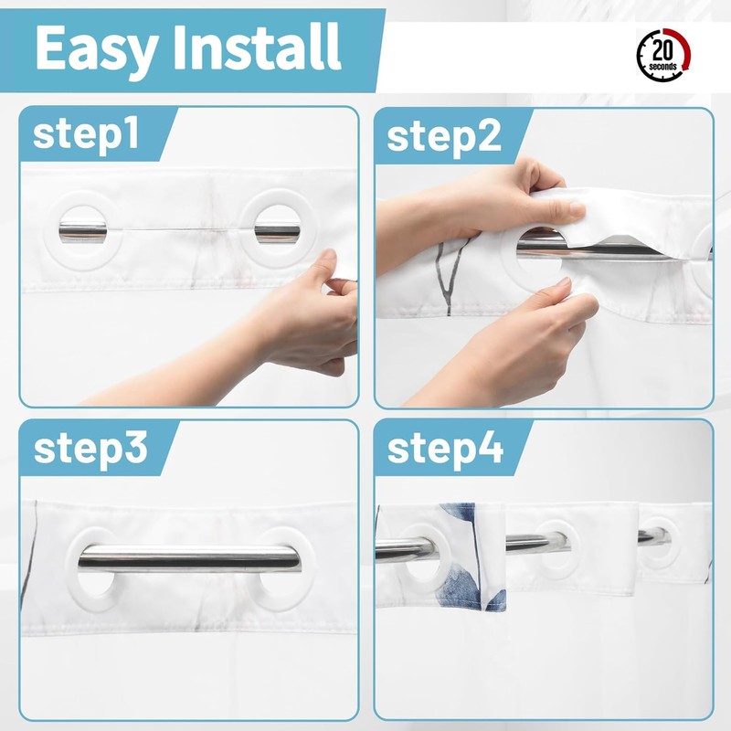 - Easy Install: No hook shower curtain set can be hung in a few seconds. Without removing the rod or extra hooks. Enjoy a cleaner, more organized bathroom space with user-friendly no hooks design that saves you time.