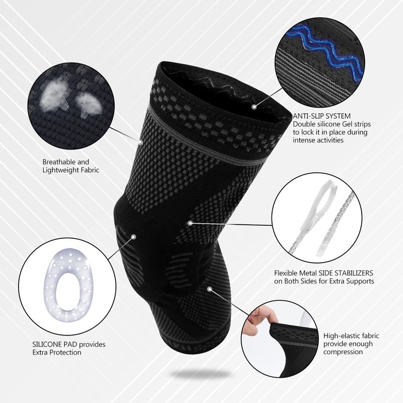- Upgraded Design: Special knitted technical design with 2 silicone strips and high-elastic fabric, ensuring your knee sleeves stay in place! Spring stabilizers and patella gel pads won't fall off easily during using.Upgrade compression knee Support offers stable pressure across your knee joint, offers optimal muscle support and full protection during your workouts and casual everyday activities. PLEASE TAKE A LOOK AT OUR SIZING CHART AND MEASURE YOUR CIRCUMFERENCE BASE ON OUR INSTRUCTIONS