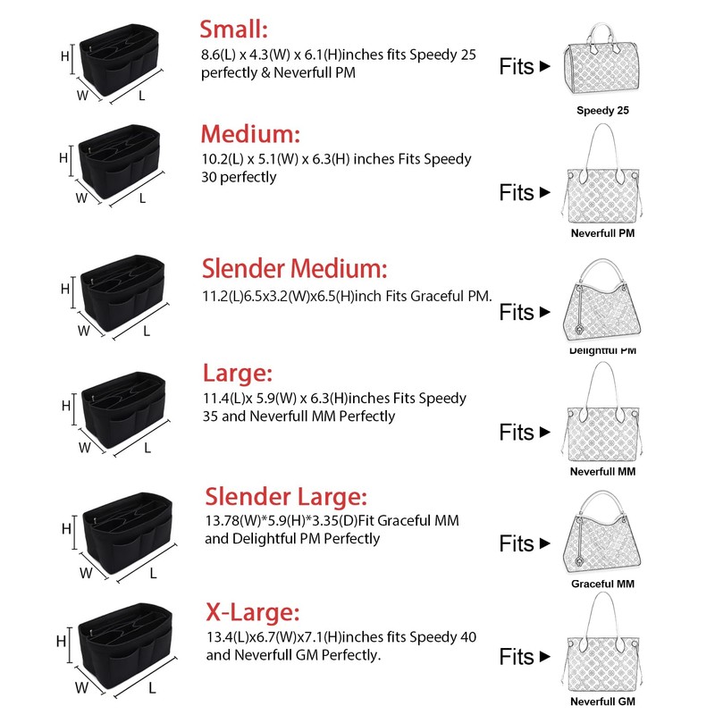 - Small:8.6(L) x 4.3(W) x 6.1(H)inches fits LV Speedy 25 perfectly & LV Neverful PM ; Medium: 10.2(L) x 5.1(W) x 6.3(H) inches Fits Speedy 30 perfectly; Large: 11.4(L)x 5.9(W) x 6.3(H)inches Fits LV Speedy 35 and LV Neverful MM Perfectly.X-Large:13.4(L) x6.7(W)x7.1(H)inches fits LV Speedy 40 and LV Neverful GM Perfectly.Portable and Compact Purse Perfectly For any Brand, Such As LV, Longchamp Le Pliage Tote, MK, LV Petit Noe, Gucci, etc.