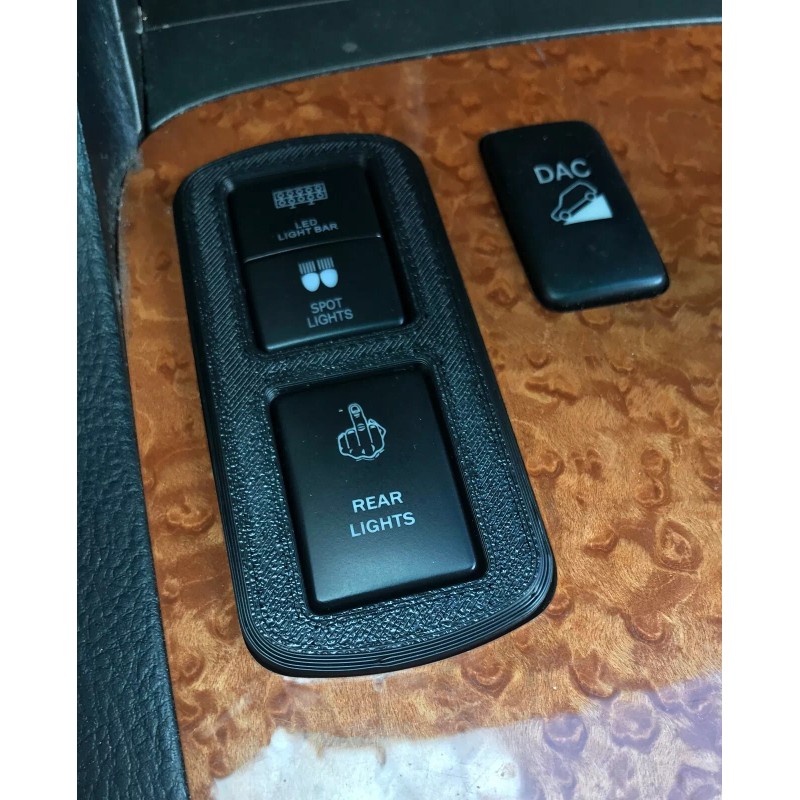 If you have removed your height controls and are adding lights and accessories to your GX470, LX470,or LC 100 series then this is a must have. 3D printed from durable, and heat resistant ABS this switch plate allows adding 2 standard Toyota style 32.5mm x 22mm switches. Snaps right in to the height control slot without any modification to the vehicle console. Switches NOT included.