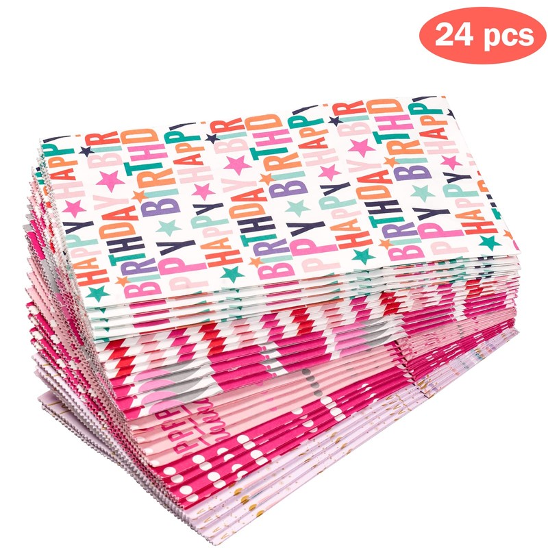 • 24-COUNT: The birthday candy bags bulk includes 24 pieces of 6 assorted designs, each measuring 9.4x5x3 inches, enough to meet your various needs.