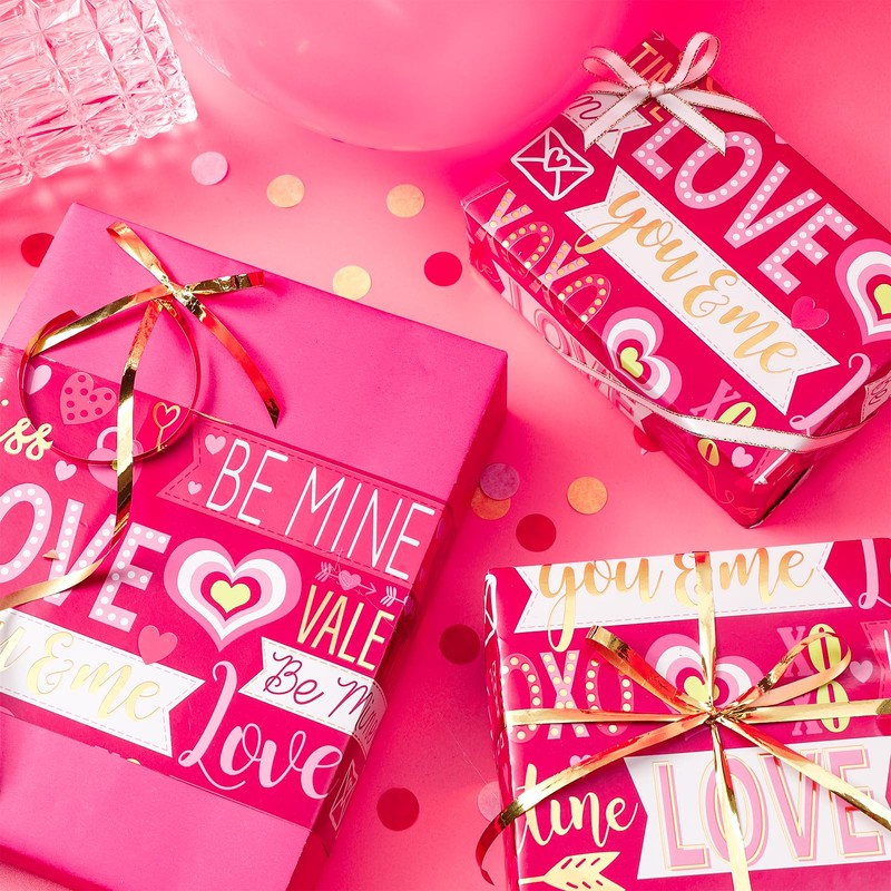 • valentine’s Day Design: The metallic foil wrapping paper with pink design with words: be mine, valentine, love, kiss, xoxo, etc. The unique design of wrapping paper could elevates the gift value easily.