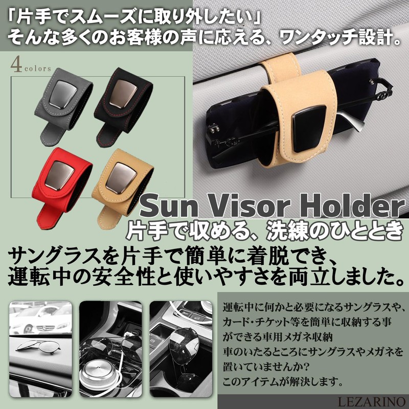 - (Luxurious and Simple Design) The LEZARINO sunglass holder will elegantly decorate your car. Adopts high quality PU leather for durability and fine hand feeling. Resistant to dirt and high temperatures, the perfect interior accessory The high-quality texture and calm colors will enhance the interior atmosphere