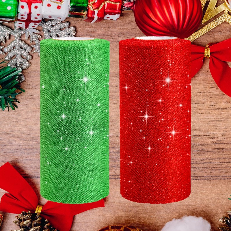 Lezevn 2 Rolls Christmas Sparking Tulle Roll Red Green Sparkling Tulle Ribbon Roll Glitter Tulle Spool for Christmas Bow Making Tutu Skirt (Red, Green)