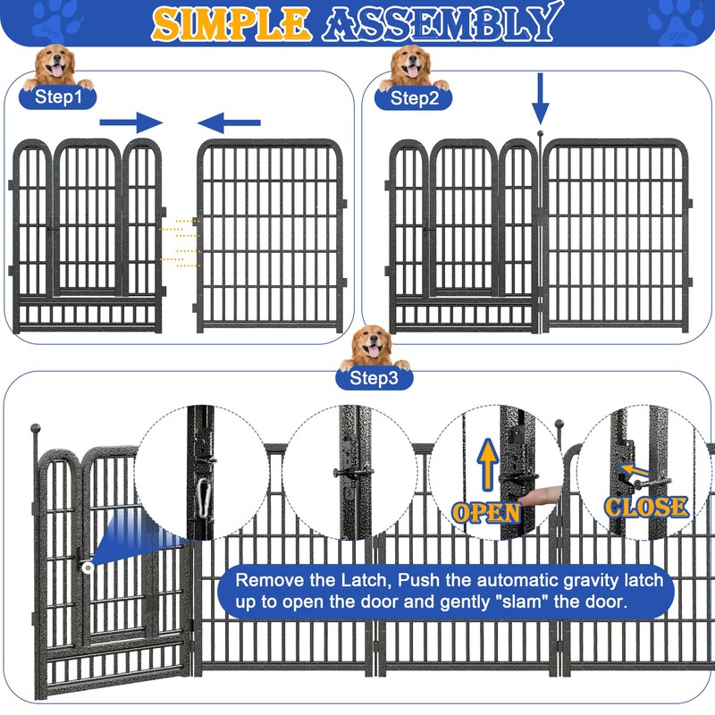- Ensuring Safty and Stability: The LFCREATOR animal playpen is designed with your pet's safety as the top priority.Featuring rounded ball tops on stakes to protect your dog's claws, and metal pet pen with weather-resistant materials and Anti-Rust Coating, it withstands outdoor elements and Prevents your dog from chewing.Our pen for dogs is professionally designed with solid structure and tight connection, not easy to loosen or tilt, providing reliable safety protection for your pet