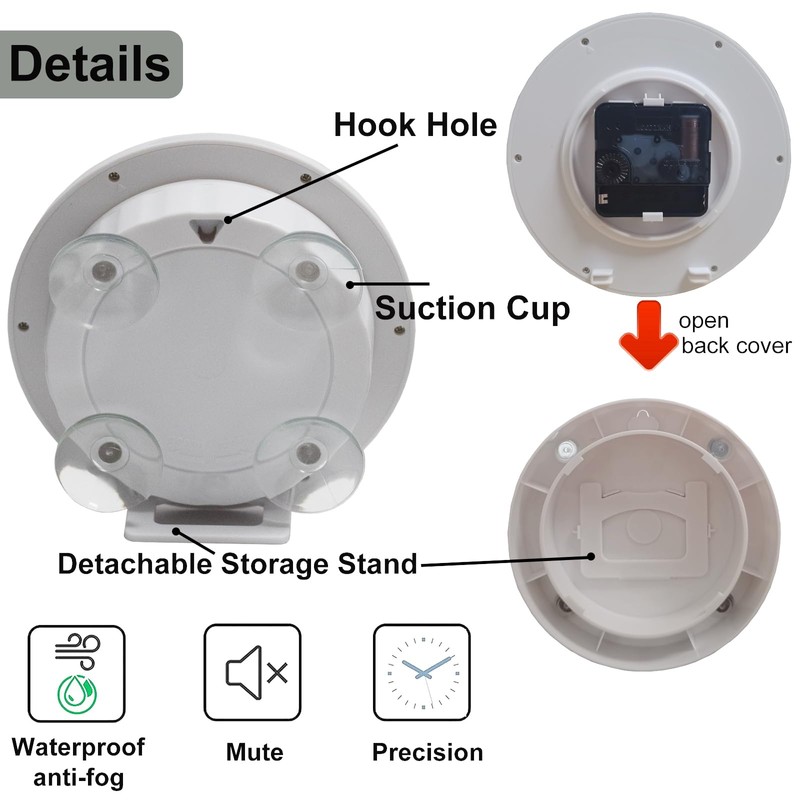 2. Please clean the contact surface before using small vacuum suction cup to attach the wall clock to the bathroom mirror or wall tiles, otherwise the suction cup will not work.