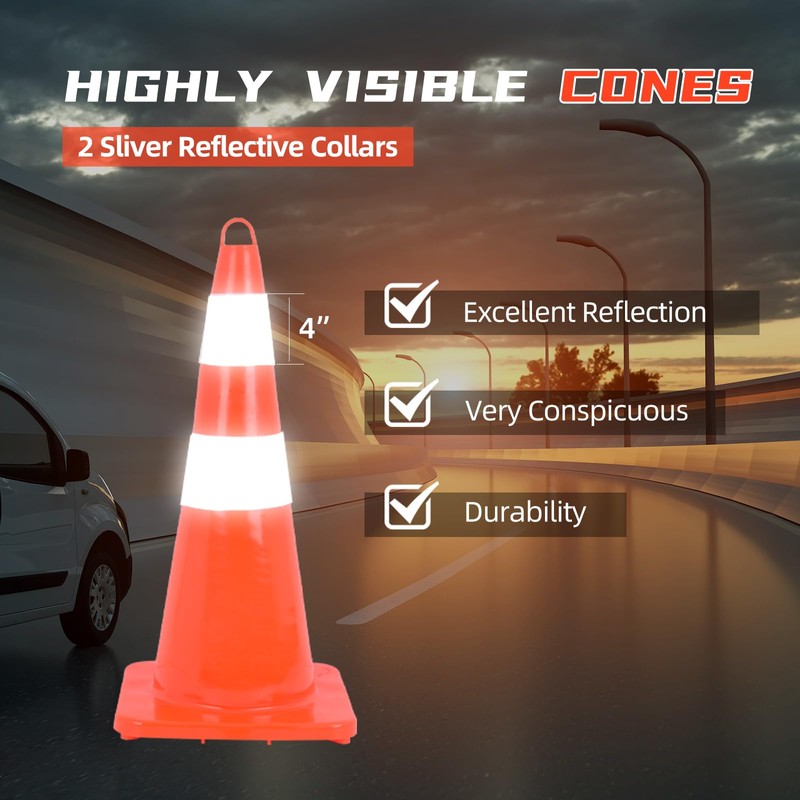 - Better Visibility: Each cone has reflective collars. These boost visibility in various weathers like rain, snow, fog, and hail, making them noticeable both day and night.