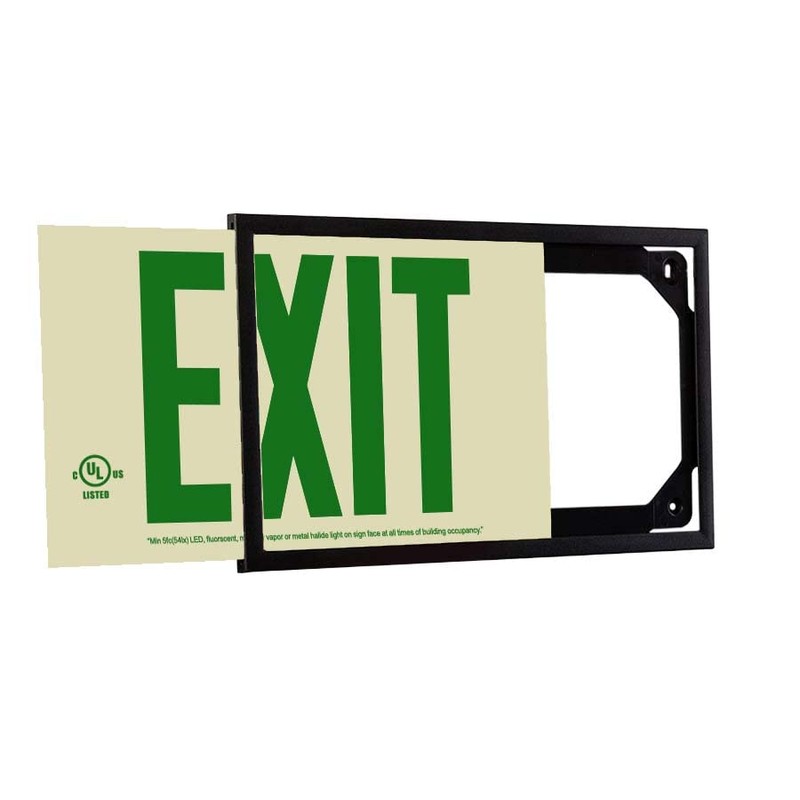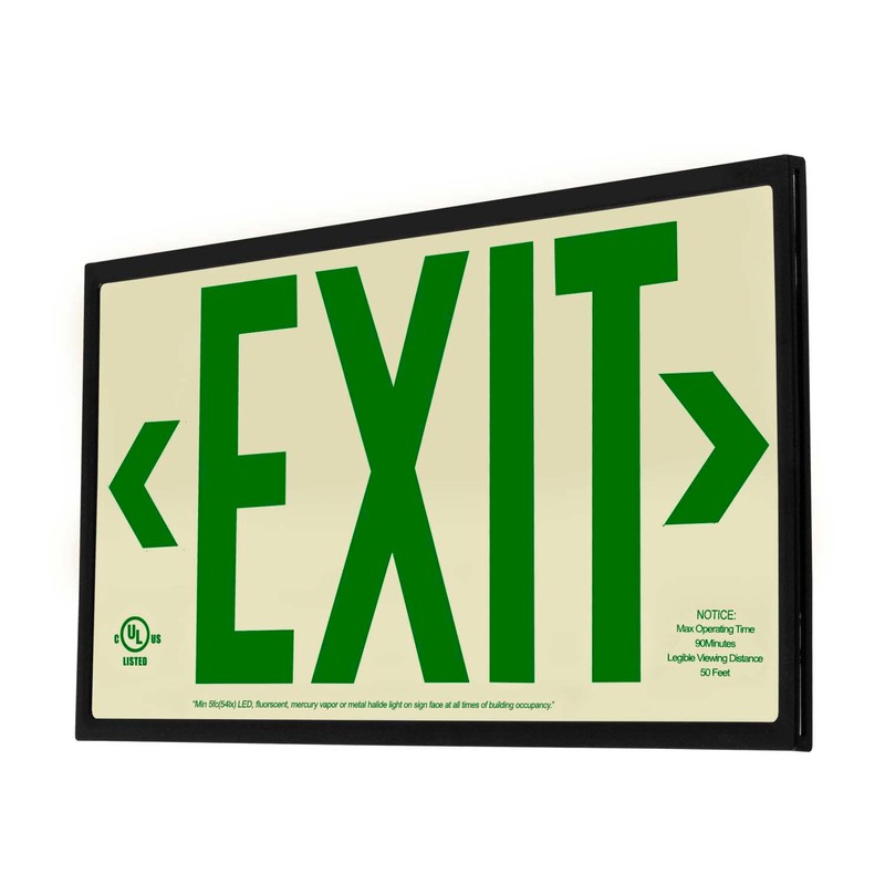 LFI Lights | Photoluminescent Exit Sign with Green Letters | Rigid Plastic | 50' Viewing Distance | Black Frame | Single Sided | Optional Adhesive Arrows | Wall Mount | UL Listed | PA1-G-50