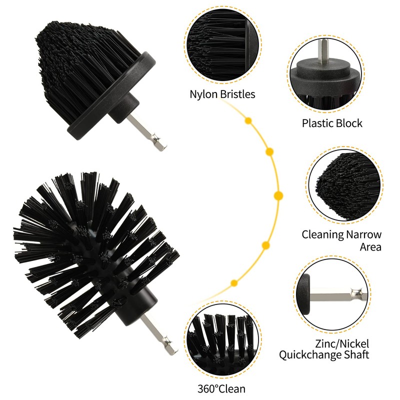 - 【Quick Change Shafts】- Each scrub brush features a 1/4 inch corrosion-resistant zinc/nickel plating molded-in quick change shaft which can fit most cordless drill or impact driver. And you can also push the end of extender for quick change.