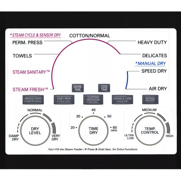 Is the writing / text smearing, smudging, or rubbing off on your LG dryer? This label decal sheet has 14 replica stickers that are scaled to fit around the knobs and buttons on your control panel.