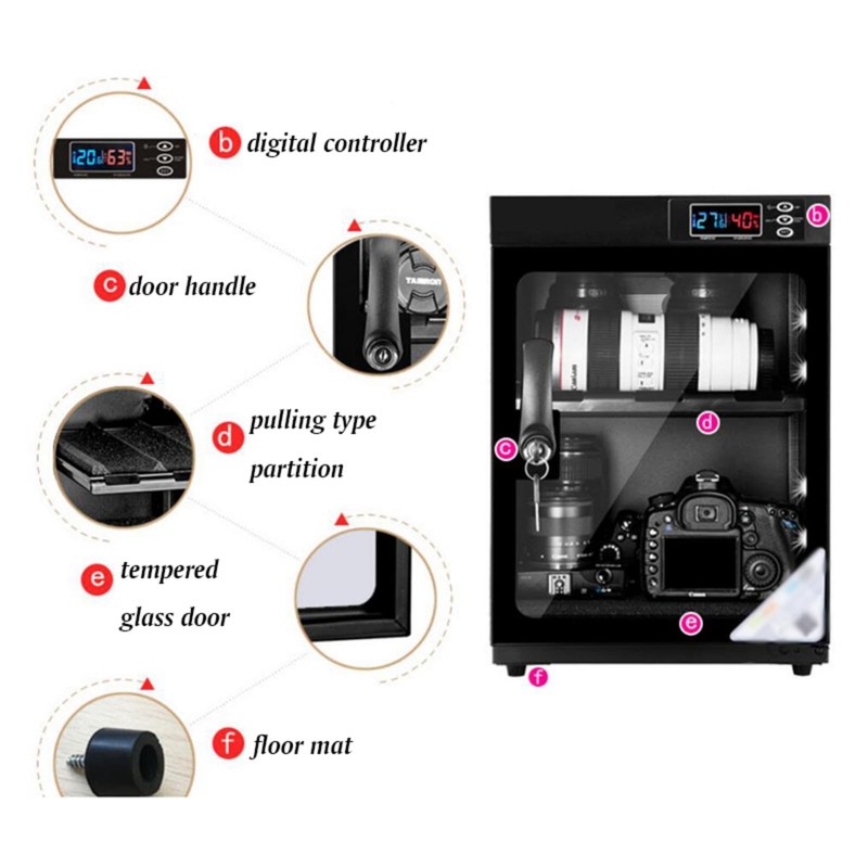 - 【Convenient to Use】Dry dehumidification cabinet box begins to work the same second the power is supplied. It has adjustable shelves for easy storage items of all sizes for you. By touching the up/ down button, you can easily adjust the Humidity. The dry box is equipped with LED spotlights inside, which is convenient to adjust humidity or check out the status of items inside in the dark.