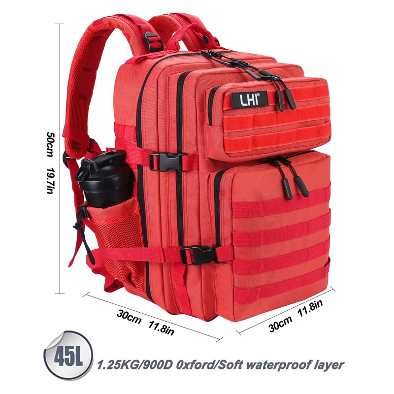 - 1. Military Tactical backpack size approx: 12inch x 20inch x 12inch, Capacity: 45L; Military backpack is made of 900 oxford nylon fabric, durable and water-resistant. Suitable for fitness, travel, hiking, camping, and other outdoor activities.