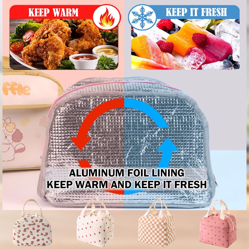 - The insulated interior of the lunch bag is lined with PEVA, and the middle layer of 5mm encrypted pearl cotton provides excellent thermal insulation. This design helps maintain the temperature of your food, keeping it warm for up to 8 hours, depending on the local climate.