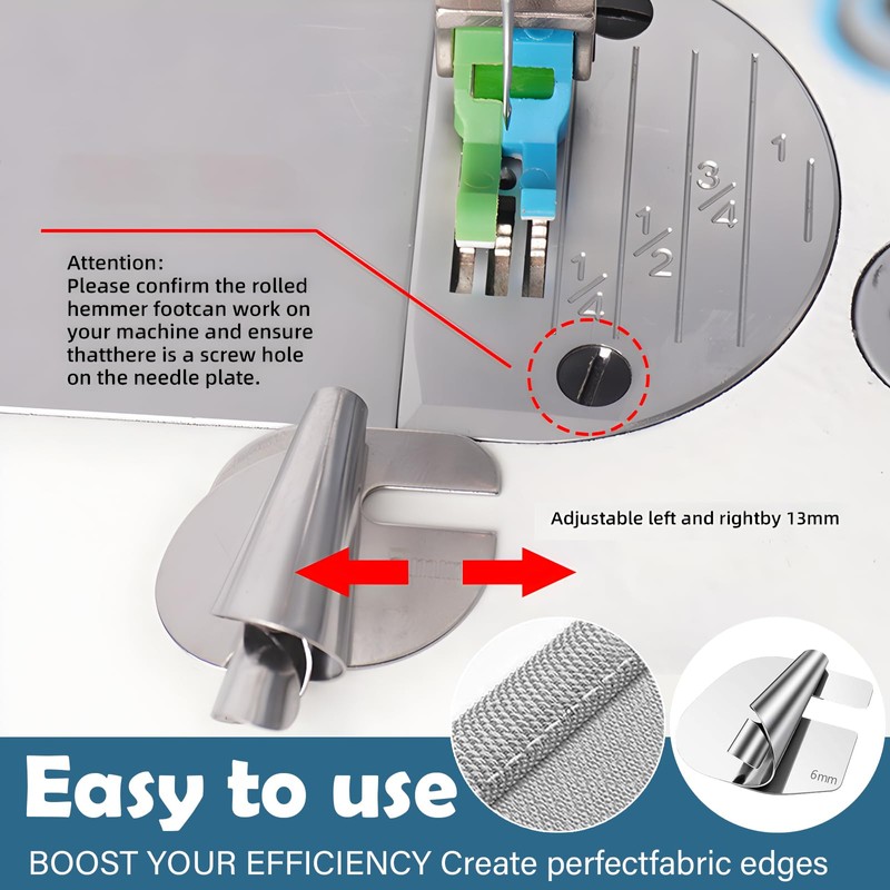 - Get your sewing work done more efficiently with a set of magnetic seam guide and 6mm rolled edge presser foot. Unique rolled edge design ensures quick fabric folding and saves time and energy.