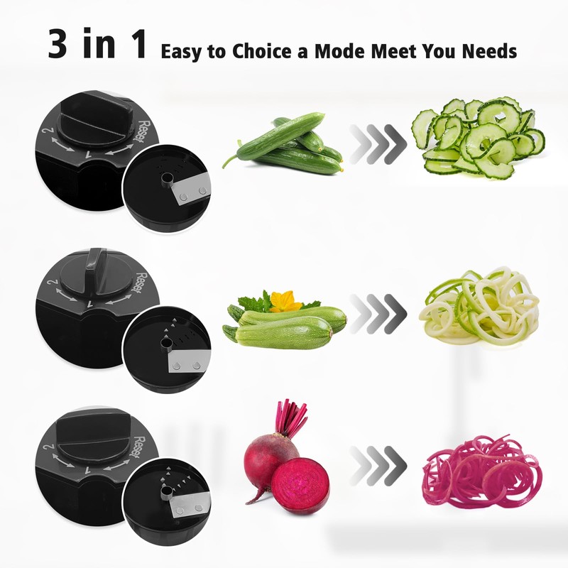 - 3-in-1 Multifunctional Spiralizer - Upgrade your kitchen with this Spiralizer 3-in-1 design, offering straight slicing, spiral cutting, and julienne shredding in one compact tool. Perfect for crafting zucchini noodles, carrot ribbons, or crispy salad toppings – effortlessly diversify your meals with a single gadget.