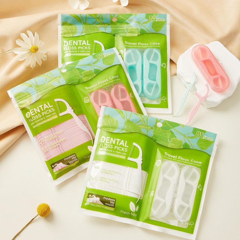 - LIAMOSS Green Mint Floss Picks 2 green cases (10 picks each) + 65 refills Dual-line floss cleans deeper than regular floss Minty freshness fights bad breath Ergonomic non-slip grip for comfort Compact & portable - great for travel Snap-lock keeps picks hygienic Eco-friendly green design