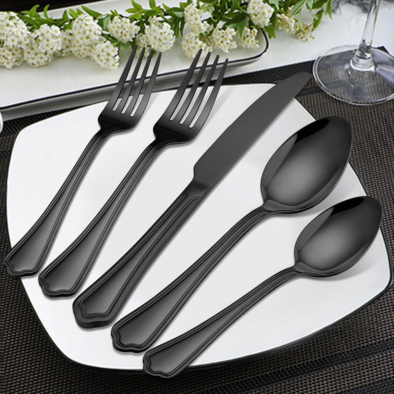 - Decent quality, this 40pcs black flatware set is made of high quality stainless steel ensures health and durability, rust resistant and without any harmful substances, solid constructions and durable enough for long time usage, no worry about it will bend after heavy use
