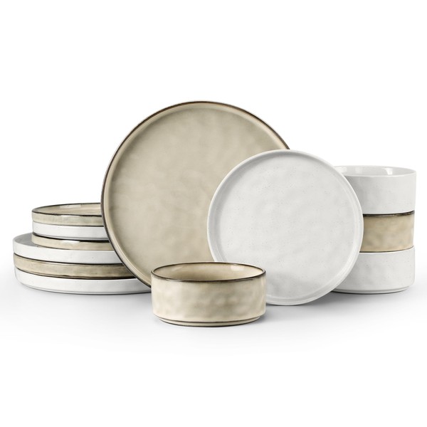- 12 Piece dinnerware sets for 4, includes 2 polar white dinner plates, 2 sandy beige dinner plates 2 polar white salad plates, 2 sandy beige salad plates, 2 polar white cereal bowl and 2 sandy beige cereal bowls, shallow raised edges to prevent spills yet shallow for easy access to the food, perfect combination of functionality and aesthetic appeal, suitable for a variety of occasions, whether a formal banquet or a casual family meal