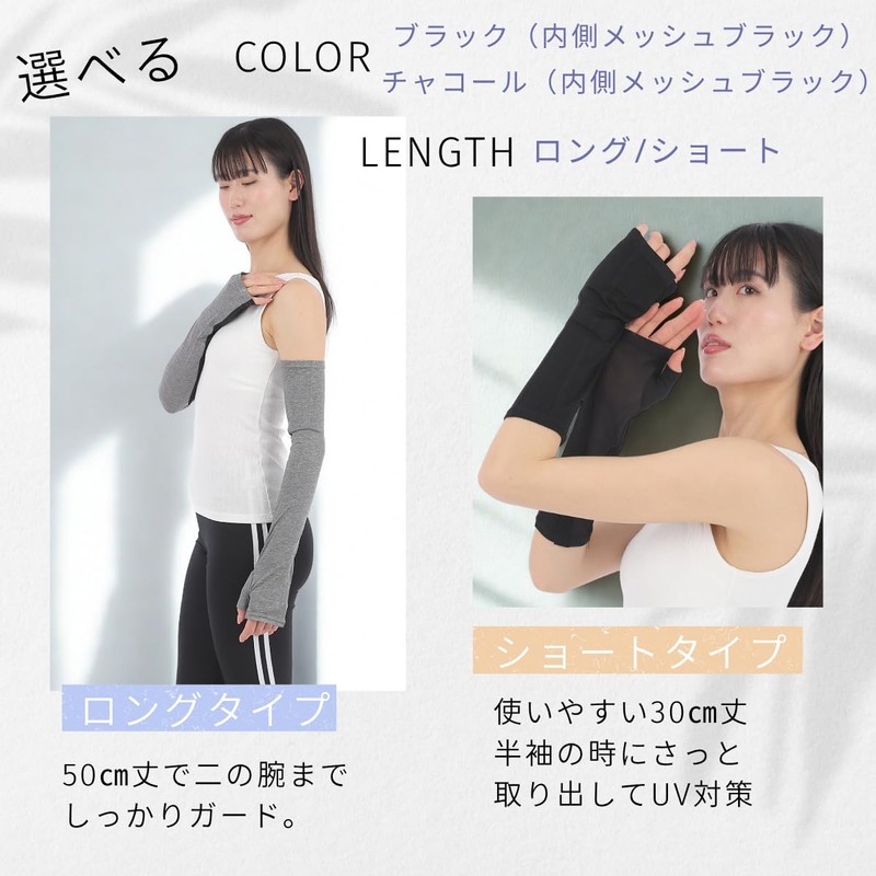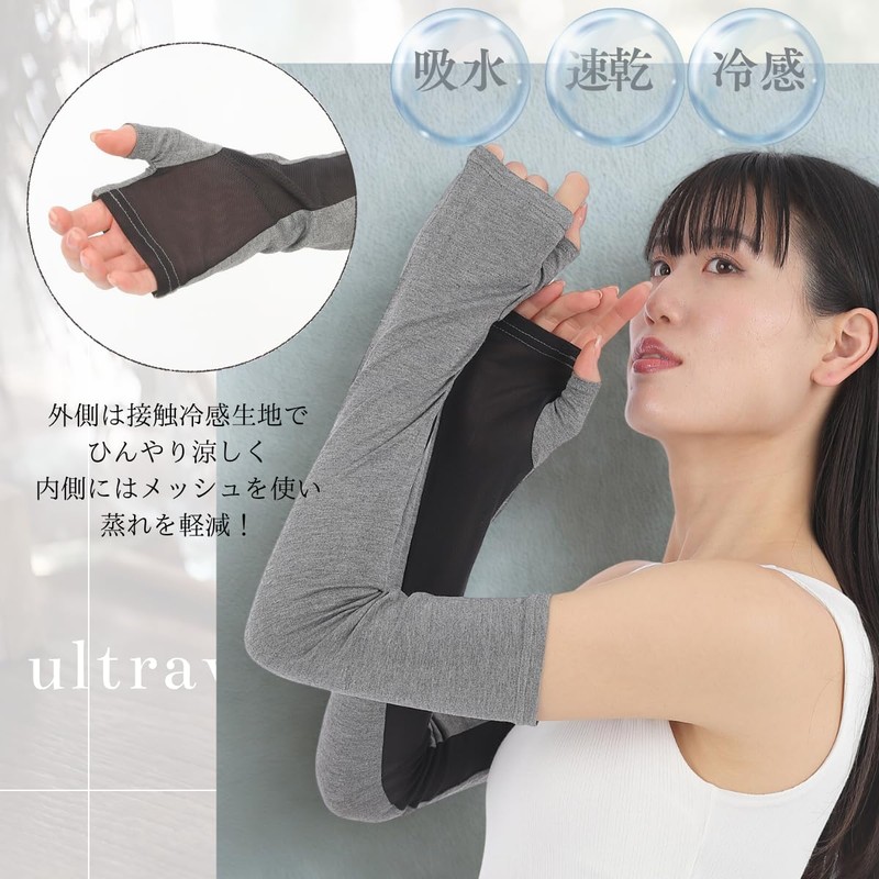 - 暑い季節でも快適に過ごせる、接触冷感素材のアームカバー。肌に触れた瞬間ひんやり感じる素材に加え、内側は通気性のよいメッシュ構造で蒸れにくく、汗ばむ季節もサラッと快適に着用できます。