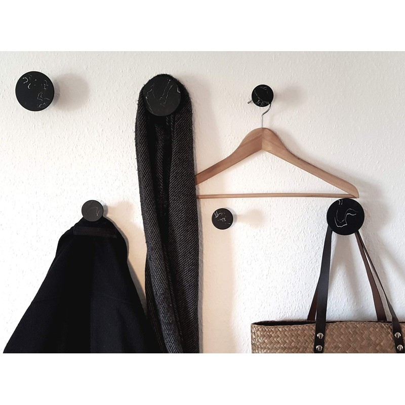 - Material and dimensions: artificial stone (polyresin) black marbled with steel screw, set of 6 consisting of 3 large (diameter 8 cm) and 3 small (diameter 4.5 cm) hooks