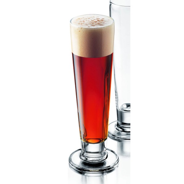 A tall and slender glass is best for serving lighter, delicate or effervescent beers such as pilsners, lagers and wheat beers. The narrow shape shows off beers with brilliant clarity and allows you to see the beer sparkle as streams of bubbles rise to the surface. The narrow shape is also ideal for pilsners and wheat beers because it enhances the aromatic qualities of these delicate styles. Set of 4.