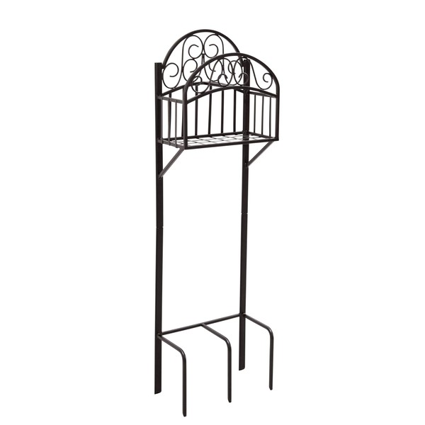The Liberty Garden 119-KD Decorative Garden Hose Stand w/Storage Shelf compliments any style of home décor. This hose stand features a useful storage shelf for those frequently used garden tools. The 5-prong anchors easily secure this hose stand in place; no post holes to dig or cement to pour. Made of durable heavy gauge steel with a black satin powder coat finish for weather resistant use. Holds up to 125-feet of 5/8-inch garden hose (hose not included). Stylish, functional and durable construction! Easy to assemble. Color: black satin.