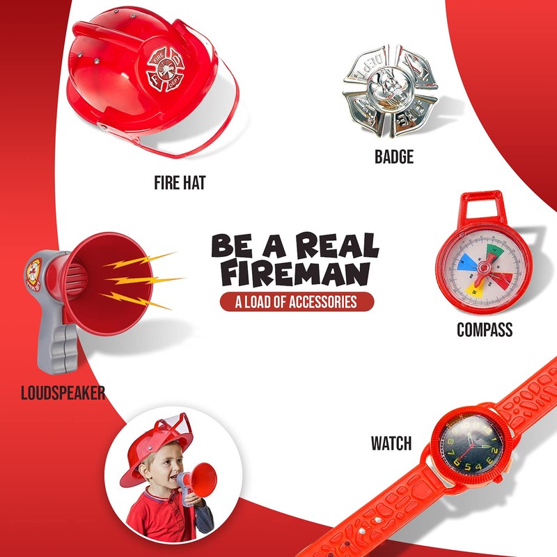 - RUN TO THE RESCUE: Get ready for action-packed playtime with this 10-piece Fireman Gear Firefighter Costume! Equip your little hero with realistic accessories, fueling their imagination for heroic missions!