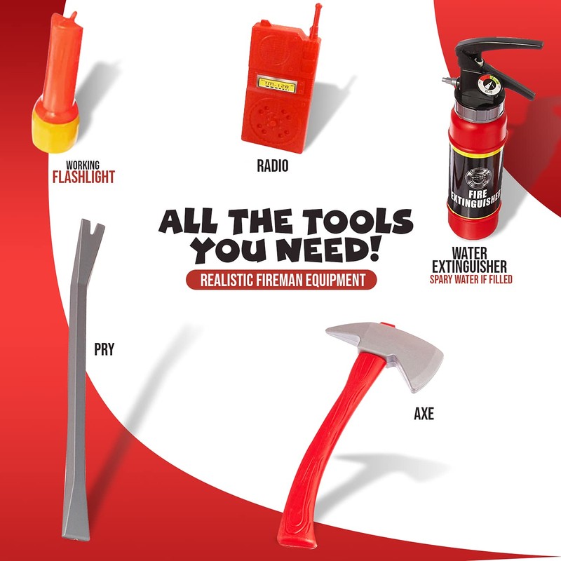 - FIREFIGHTER FRENZY: Watch your child's face light up as they explore the thrilling world of firefighting with a working megaphone, flashlight, badge, compass, hatchet, crowbar, watch, pretend walkie talkie, and more!