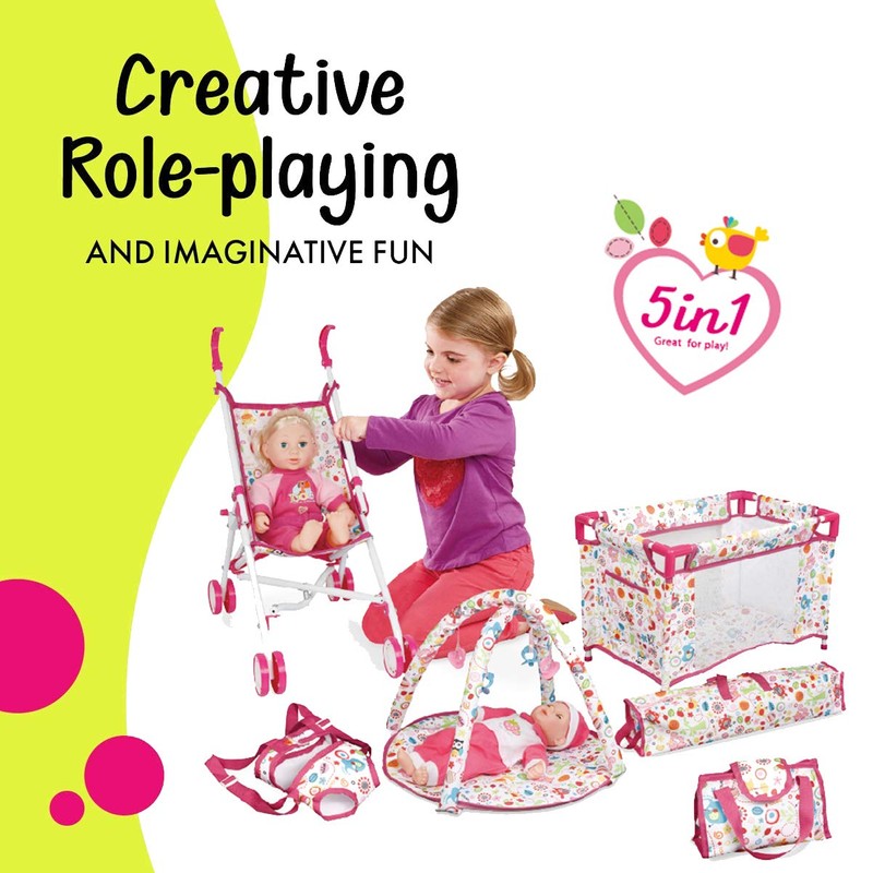- COMPLETE NURSERY PLAYSET: This 5-in-1 deluxe newborn baby doll stroller playset includes a stroller, baby carrier, playard, play mat, and travel bag, providing a comprehensive role-play experience.