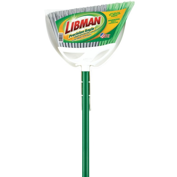 Make a clean sweep with Libman Precision Angle Broom and dustpan. This extra wide broom makes maintaining hard floor surfaces simple, from wood and concrete floors to tile and linoleum. The Libman angle broom has a steel handle connected to a one-piece resin block with strong polymer fibers that grip dirt and dust for effortless cleaning. The rugged bristles are crafted from a special, fiber made from recycled PET bottles. A wide 11" sweeping surface facilitates faster cleaning. The angled bristles can reach places that dust and dirt collects much easier than traditional straight edges, making easy work of sweeping up under cabinets, furniture and even in tight corners. Paired with the Libman 10" White Wide Scoop Dust Pan, this angle broom and dustpan combo is designed to help you tackle even your toughest tasks. Additional Libman products are sold separately.