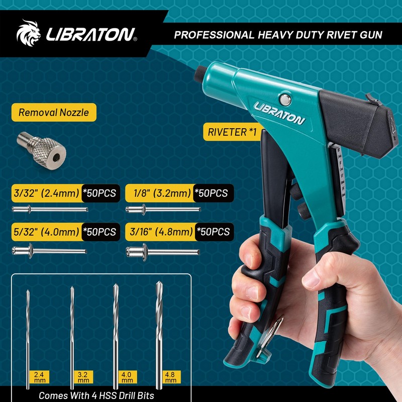 LIBRATON Professional Heavy Duty Rivet Gun, One-Handed Pop Rivet Gun Set, Robust Riveter with Shaft Container, Manual Riveting Tool, Tool-Free Interchangeable Heads, for Metal, Wood and Plastic
