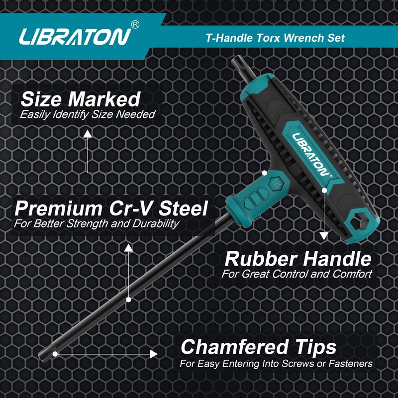 - Popular Sizes: Libraton T-handle allen wrench set includs 7 common TORX wrenchs: T10, T15, T20, T25, T27, T30, T40.