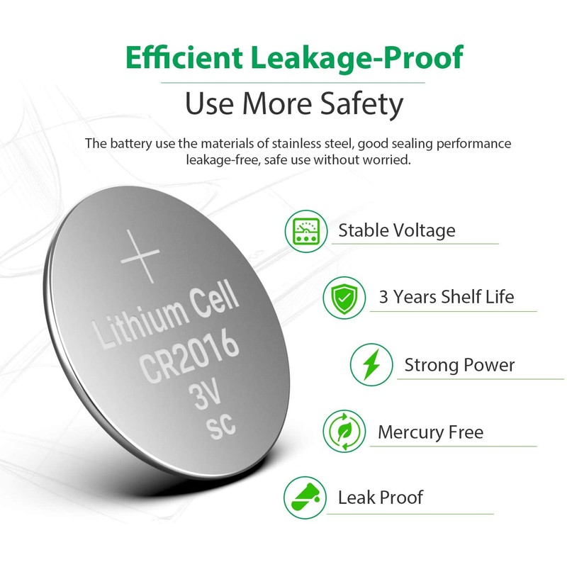- Safety AND LEAK FREE -- Zero Mercury LiCB CR2016 Batteries Offer Premium Performance in a Variety of Devices. LiCB Batteries are Designed not to Leak in Devices During Their Usage and for up to 3 Years after They are Left in a Device.
