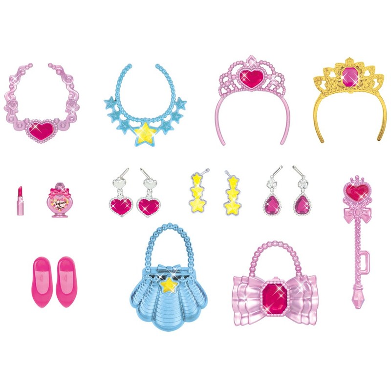 - Set Includes: Doll (dress, earrings, underwear) (1), shoes (pumps) (1), tiara (2), necklace (3), earrings (1), stick, (2), perfume (1), lip (1),