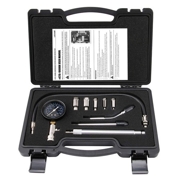 - UNIVERSAL: INCLUDE 9 CONNECT ADAPTERS --- 10-in-1 engine tester gauge kit includes 1-piece spring buckle gauge; 5-pieces brass adapters M10, M12, M14, M16, M18 for wide applications; 2-pieces straight and angled connector for direct testing; extra long 8 inches extension tube and 16 inches extension hose for long reach testing.