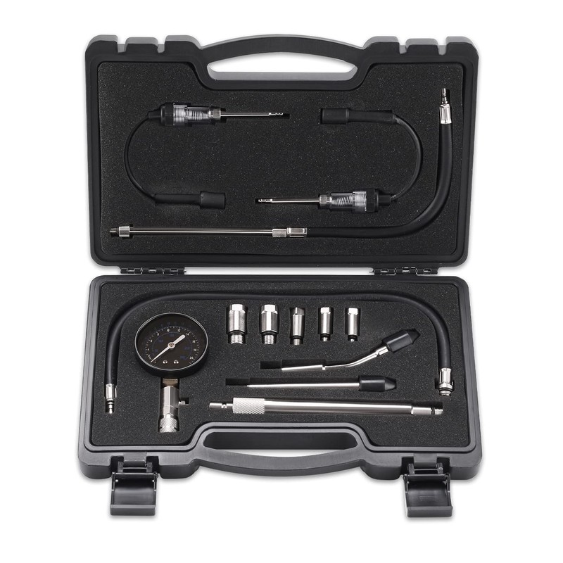 - UNIVERSAL: INCLUDE 10 CONNECT ADAPTERS --- 13-in-1 engine tester gauge kit includes 1-piece spring buckle gauge; 5-pieces brass adapters M10, M12, M14, M16, M18 for wide applications; 2-pieces straight and angled push-on connectors for direct testing; 1-piece extra long 8 inches extension straight rod, 1-piece 12 inches M12 extension hose rod and 1-piece 16 inches extension hose for long reach testing. Come with extra 2-piece spark plug testers.