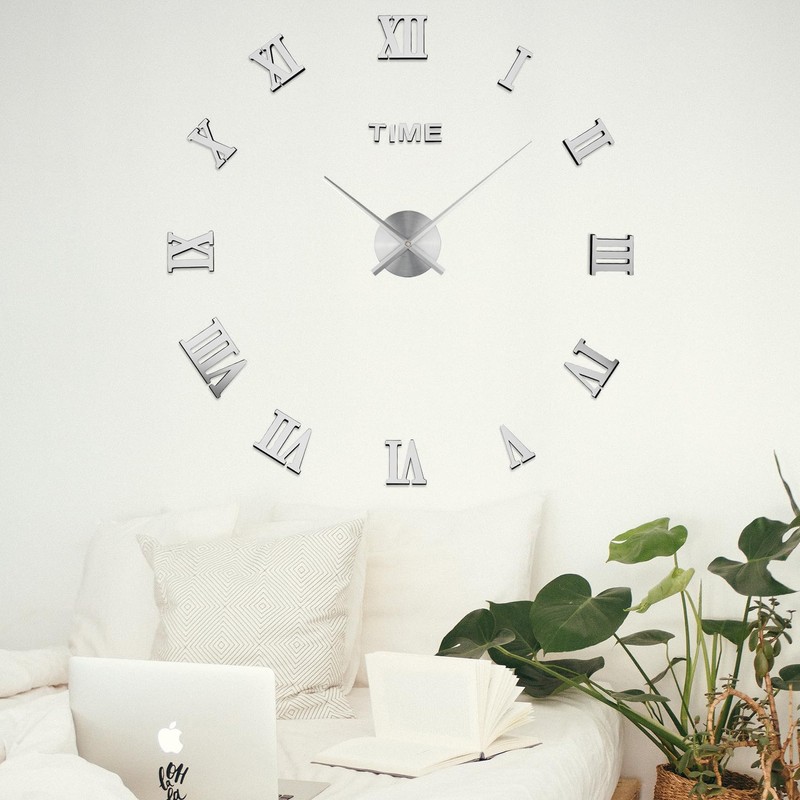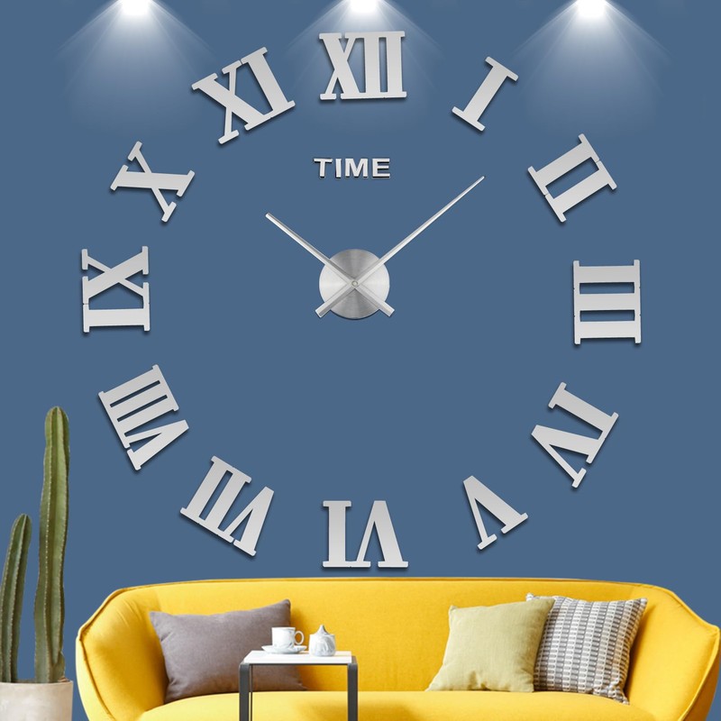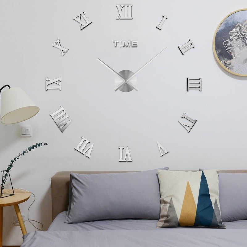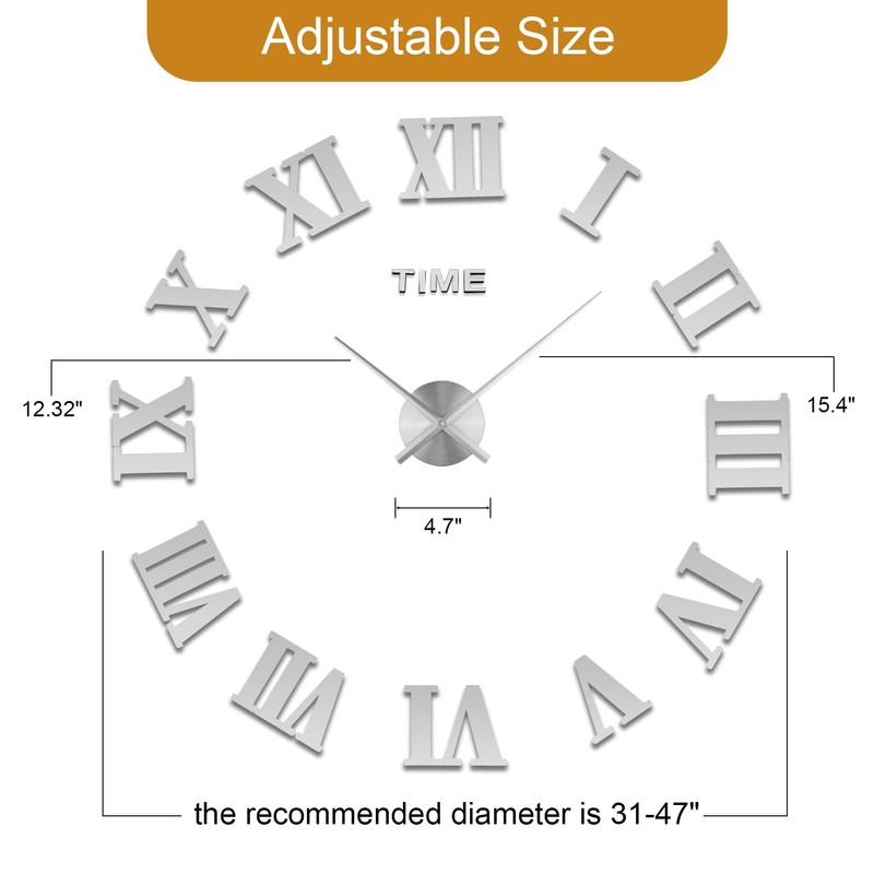 LIDNADY Roman Numerals DIY Wall Clock, Frameless, Large Modern Design, Silver, Adjustable Size, Easy to Install