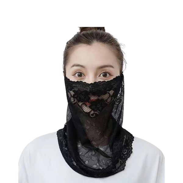 [Liebendo] フェイスカバー レディース 息苦しくない 4Way ネックカバー ネックガード フェイスガード 耳掛け 首周りガード 速乾 可愛い メッシュ レース フェイスマスク UVカット 日焼け 紫外線対策 (ブラック)