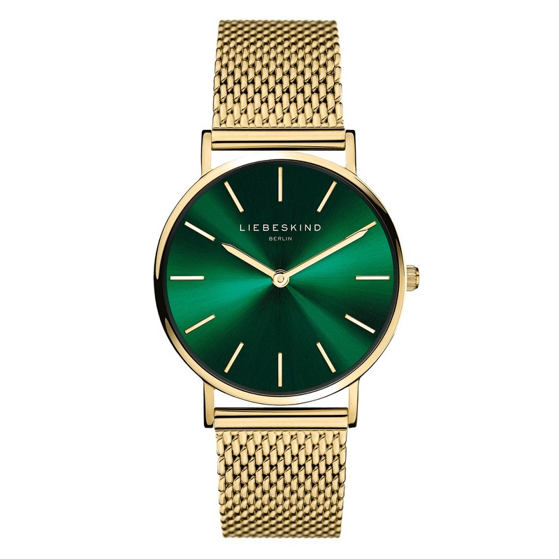 - Extra-flaches Gehäuse aus poliertem, goldfarbenen Edelstahl, 34 mm, Gehäusehöhe 7 mm kratzunempfindliches Mineralglas auf dem grünen Zifferblatt sorgen goldfarbene stundenindexe für optimale Ablesbarkeit