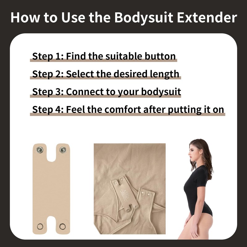 - Premium Construction: Crafted with premium metal snaps, our bodysuit extenders for women ensure lasting durability and stability. These bodysuit extenders offer a secure and adjustable fit, ideal for extended wear and enhanced comfort.