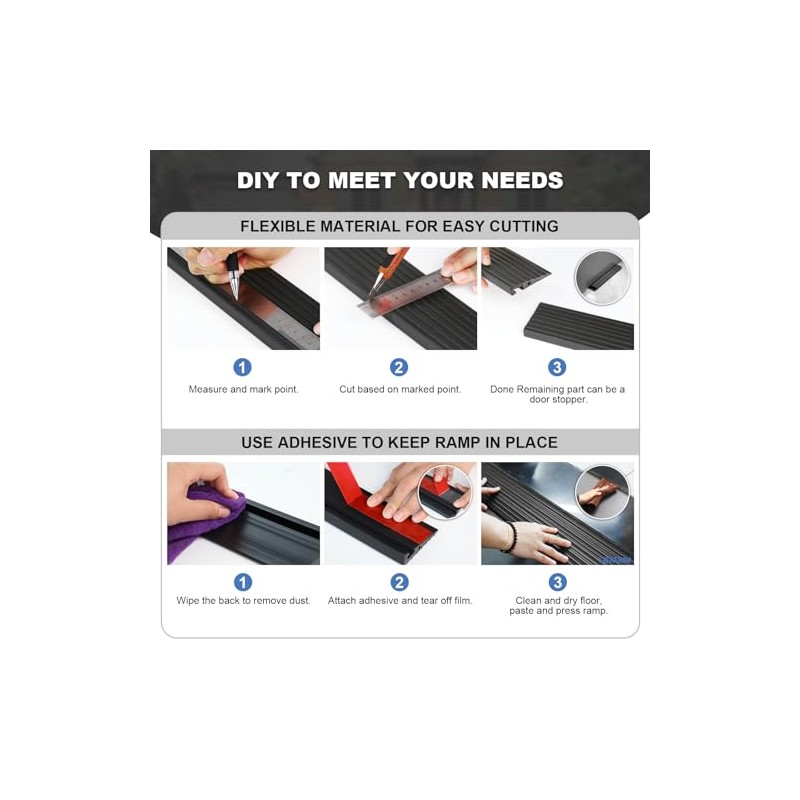 • Free to DIY & Quiet After receiving our PVC threshold ramp, if it is too width for use, you can cut or spliced to apply to your applicable places. It not only reduce the threshold so that wheelchairs can enter or pass through with ease, it also prevent loud noises from being made when passing through the threshold.