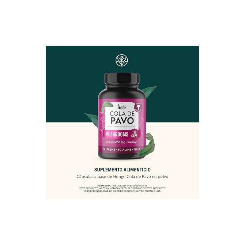 LIFE 360+ - LIFE 360+ Cola de Pavo | Extracto Puro de Hongo Cola de Pavo en Cápsulas | 180 Cápsulas | 90 Porciones de 1232 mg | Suplemento Alimenticio a Base de (Coriolus versicolor). 💯 Autenticidad y máxima durabilidad comprobadas. Materiales de alta gama y acabados premium. 🔥 Alta demanda - Stock limitado. Ideal para quienes buscan lo mejor en calidad y estilo. Producto auténtico con satisfacción total asegurada. ¡No te quedes sin el tuyo y aprovecha esta oportunidad única!