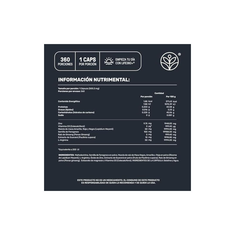 LIFE 360 Mens Testo  360 Cpsulas  Maca Negra, Maca Roja y Maca Amarilla, L-Arginina, Zinc, Vitamina D, Magnesio, Ginseng y Guarana  Suplemento...